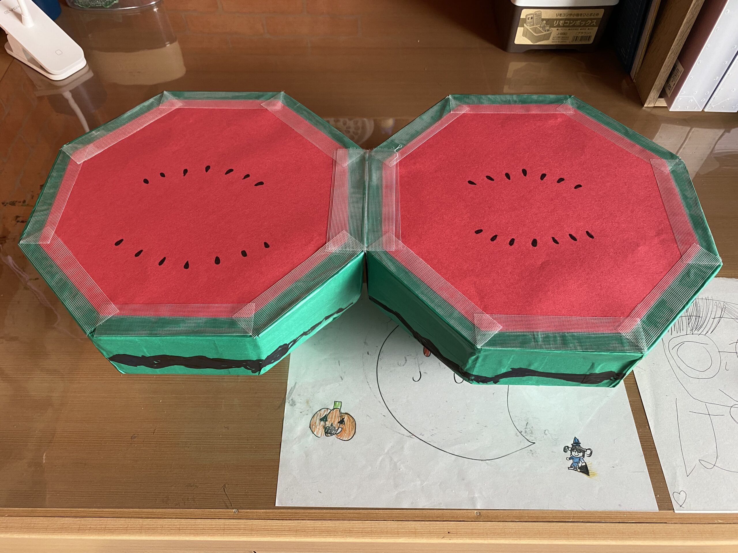 私はスイカの皮の部分を折り紙、赤い実の部分を画用紙、種や模様はマジックで描きました。